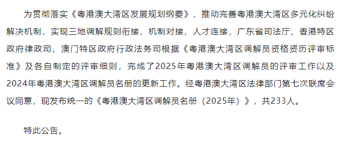 广东省司法厅关于发布粤港澳大湾区调解员名册(2025年)的公告